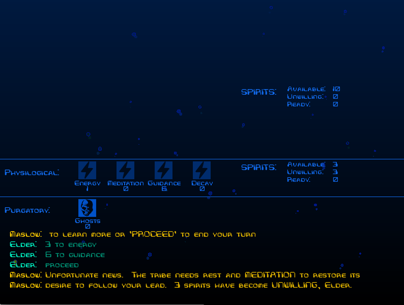 My game is called Elders of Ethos. You are an Elder of a tribe playing against other tribes, guiding your spirits to the heavens. I had 8 planes in mind, but I'm now going to focus on making it playable with only 3. Let's see what happens! :D